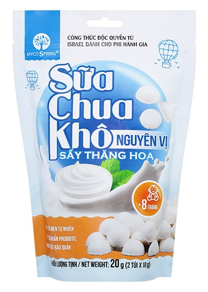 Là một trong những loại thực phẩm chứa các lợi khuẩn hoạt động, sữa chua khô MycoSpring phù hợp cho trẻ từ 8 tháng tuổi trở lên. Sản phẩm được tin dùng không chỉ vì giá trị dinh dưỡng đối với sức khoẻ mà còn vì tính tiện lợi của sản phẩm. Sữa chua khô MycoSpring chỉ cần bảo quản ở điều kiện bình thường, không cần trữ đông hay trữ lạnh. Sản phẩm có nhiều vị khác nhau nh