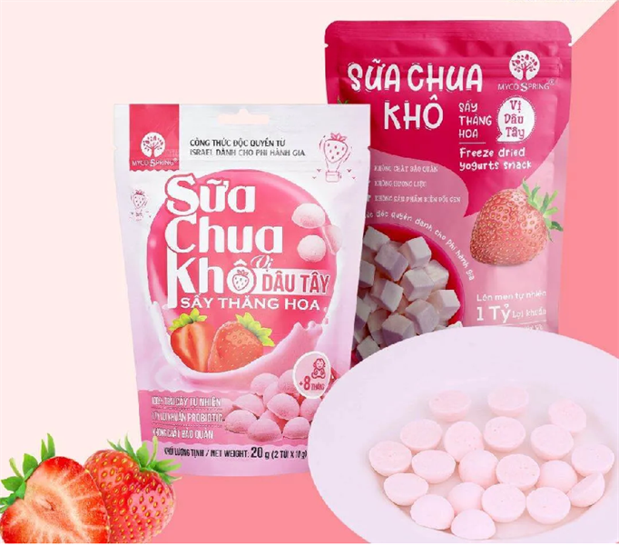Sản phẩm sữa chua khô MycoSpring là sản phẩm dinh dưỡng được sản xuất tại Việt Nam theo quy trình nghiêm ngặt đảm bảo vệ sinh an toàn thực phẩm. Sữa tươi nguyên chất có thể kết hợp với các loại trái cây tươi như chuối, xoài, dâu tây và lên men tự nhiên với các nhóm lợi khuẩn bao gồm Lactobacillus và Streptococcus Thermophilus. Sản phẩm được sấy theo công nghệ sấy thăng hoa của Israel dành cho phi hành gia nhằm giữa trọn vẹn thành phần lợi khuẩn và hương vị của sữa chua truyền thống.