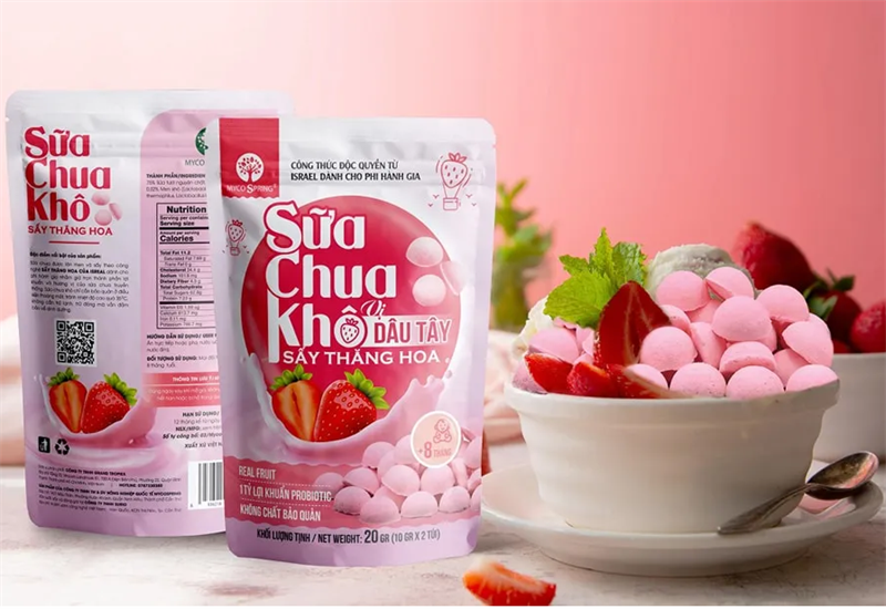 Sản phẩm sữa chua khô MycoSpring là sản phẩm dinh dưỡng được sản xuất tại Việt Nam theo quy trình nghiêm ngặt đảm bảo vệ sinh an toàn thực phẩm. Sữa tươi nguyên chất có thể kết hợp với các loại trái cây tươi như chuối, xoài, dâu tây và lên men tự nhiên với các nhóm lợi khuẩn bao gồm Lactobacillus và Streptococcus Thermophilus. Sản phẩm được sấy theo công nghệ sấy thăng hoa của Israel dành cho phi hành gia nhằm giữa trọn vẹn thành phần lợi khuẩn và hương vị của sữa chua truyền thống.